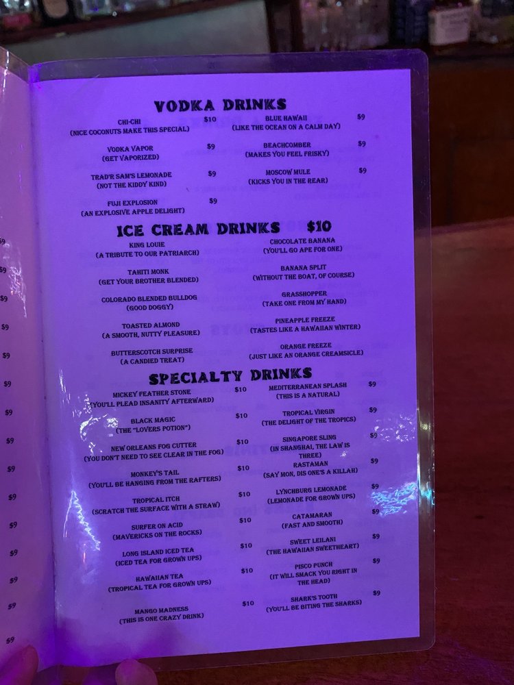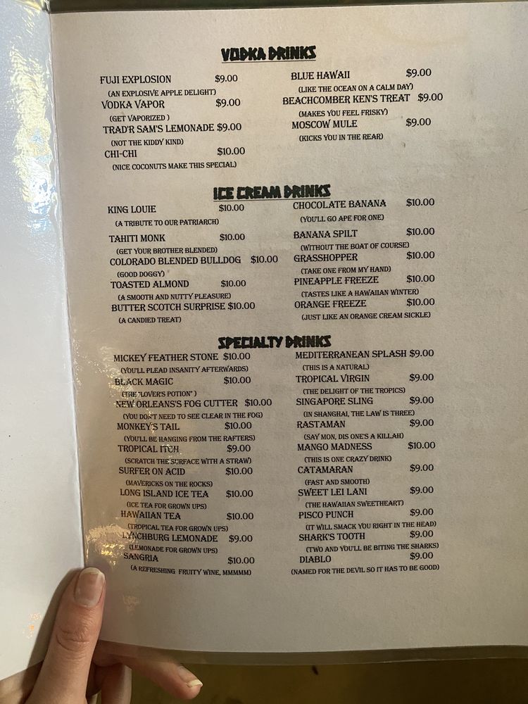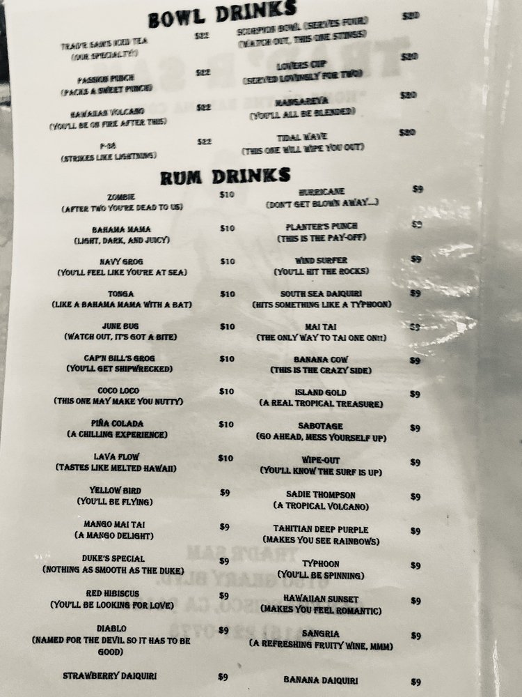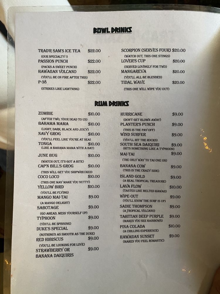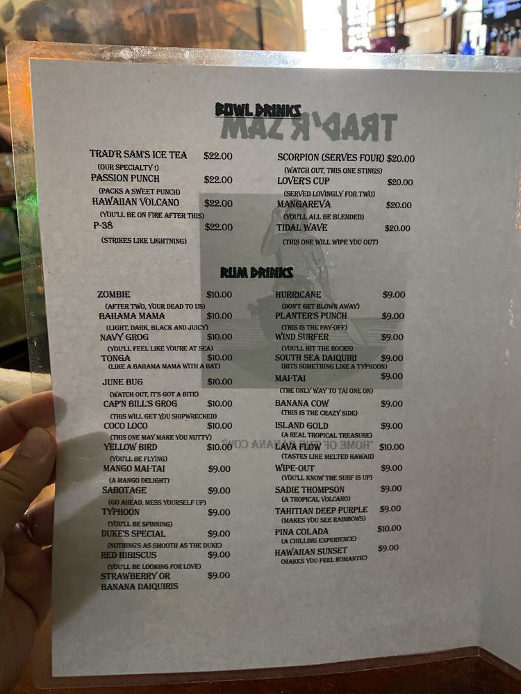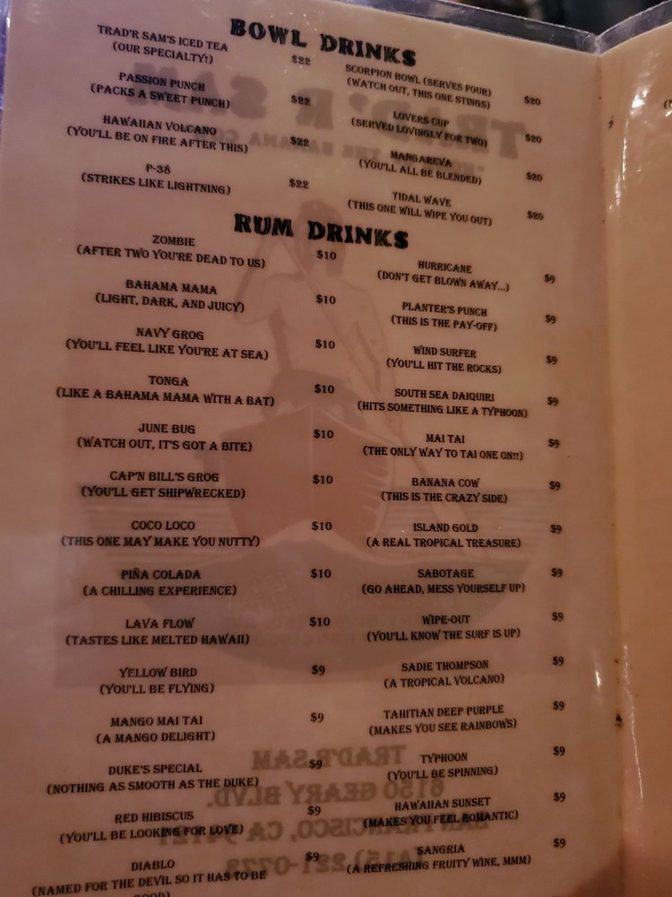 Tradr Sam, located in San Francisco, is a vibrant dive bar with a strong tiki bar vibe. The menu boasts a wide array of exotic cocktails, including the famous Trad'r Sam's Mangareva and the potent Scorpion served for four. The atmosphere is lively and perfect for group gatherings, with added perks like outdoor seating and a pool table. While the decor may not be to everyone's taste, the friendly staff and strong drinks make up for it. Customers rave about the unique experience and recommend trying the Scorpion bowl. Keep in mind that the bar only accepts cash, so come prepared. Overall, Tradr Sam is a must-visit for those seeking a fun and affordable night out in the city.